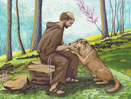 Esta história nos remete a um lobo feroz que, ao que tudo indica, apavorava a cidadezinha de Gubbio, pois que assassinava todo e qualquer ser vivo por aquela região. O que ninguém sabia - ou tampouco se importava - é que ele também passava por necessidade, pois não tinha mais o que comer. Francisco, que por ali se instalou nesta época, soube da situação e foi ter com a fera, ao que - conta-se - por milagre de Deus, a fera não só não o atacou como também o ouviu, fazendo com o Poverello de Assis um acordo: não atacaria mais o povo da cidade e este o alimentaria. Resultado: a cidade passou a cuidar dele, e o lobo, tornou-se seu protetor até os últimos dias de sua vida!
